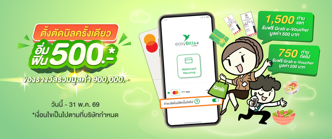 - * ภายใต้เงื่อนไขของกิจกรรมส่งเสริมการขายนี้ “รายการที่ทำสำเร็จ” หมายถึง รายการชำระเงินด้วยการตัดเงินโดยอัตโนมัติจากบัญชีบัตรเครดิต Mastercard ที่ลูกค้านำมาผูกกับบิลของผู้ขายสินค้าหรือผู้ให้บริการตามที่กำหนดภายใต้เงื่อนไขของกิจกรรมส่งเสริมการขายนี้ เพื่อใช้บริการผูกบัตรเพื่อตัดจ่ายบิลอัตโนมัติกับ easyBills+ (จำกัดเฉพาะบนแอปพลิเคชั่น easyBills+ หรือบนเว็บไซต์ https://ebills.asia/th) ภายในระยะเวลากิจกรรมช่วงที่ 1 เพื่อจ่ายบิลให้กับผู้ขายสินค้าหรือผู้ให้บริการตามที่กำหนดในเงื่อนไขของกิจกรรมส่งเสริมการขายนี้ ดังกล่าวข้างต้น ที่ธนาคารผู้ออกบัตรอนุมัติการทำรายการให้สามารถดำเนินการตัดเงินจากบัญชีบัตรเครดิต Mastercard นั้นๆ เพื่อชำระให้กับผู้ให้บริการหรือผู้ขายสินค้านั้นๆ ได้ ทั้งนี้ การอนุมัติหรือปฏิเสธการทำรายการเป็นไปตามกฎเกณฑ์ที่กำหนดโดยธนาคารผู้ออกบัตร